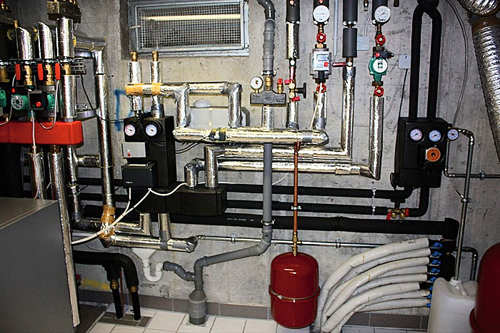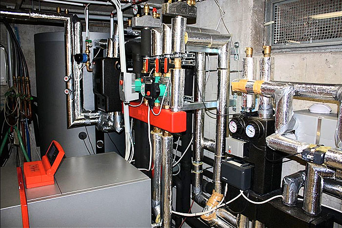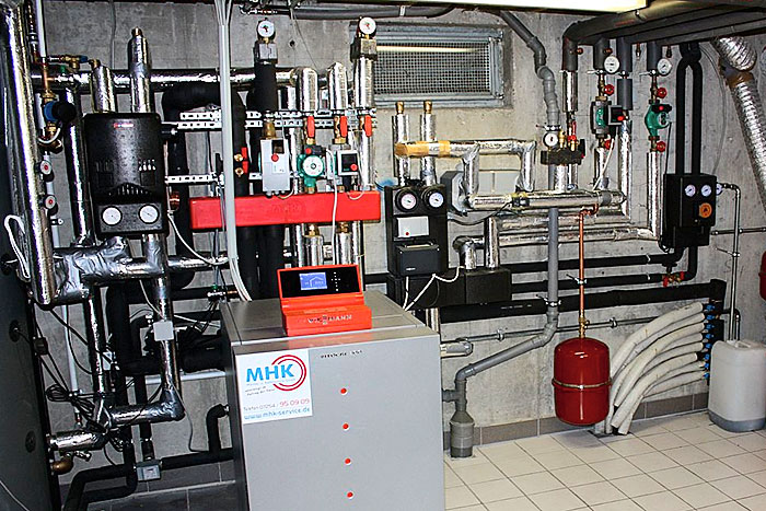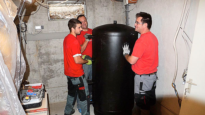 Bei der Heizungssanierung in einem bestehenden Gebäude wurde die alte Ölheizug durch eine Anlage mit der Luft-Wasser Wärmepumpe Vitocal 350 von Viessmann ersetzt. Die Wärmepumpe wurde innen in einem separaten Abstellraum installiert. Sie ist durch eine Wand von der restlichen Installation getrennt. Das Heizungswasser wird in einem 800 l Pufferspeicher gespeichert. Das Brauchwasser wird von der Wärmepumpe erzeugt und in einem separaten Behälter gespeichert.