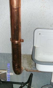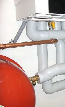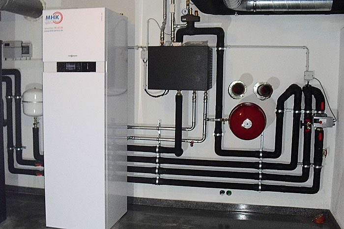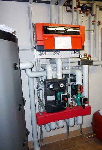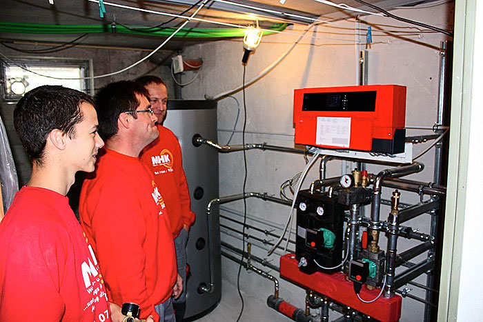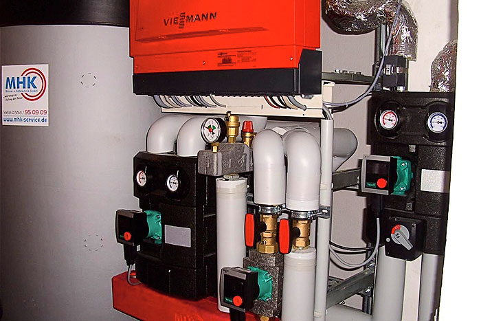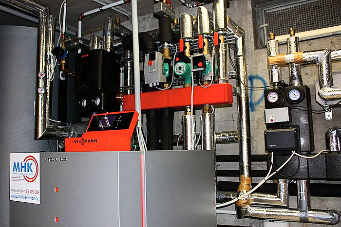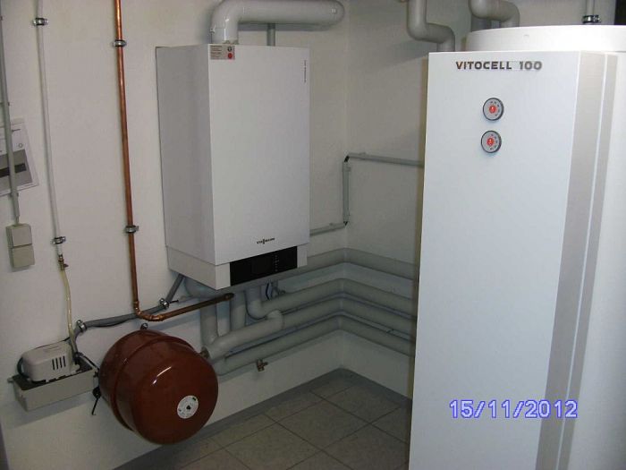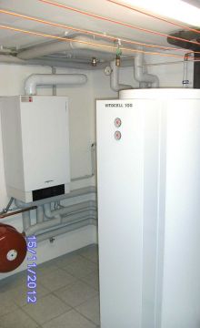 In einem bestehenden Gebäude wurde die alte Heizung durch eine Kombination aus Gas-Brennwertkessel und Warmwasserbereitung mit Solarunterstützung ersetzt. Für die Heizung kam das Brennwertgerät Vitodens zum Einsatz. Als Warmwasserspeicher wird das Vitocell 100 eingesetzt. Das Warmwasser wird durch ein Solarmodul auf dem Dach erwärmt. Sollte dessen Energie nicht reichen, wird elektrisch zugeheizt. Die Leitungen zum Solarmodul auf dem Dach werden durch ein Kupferrohr geführt. Alle Komponenten sind von der Firma Viessmann.