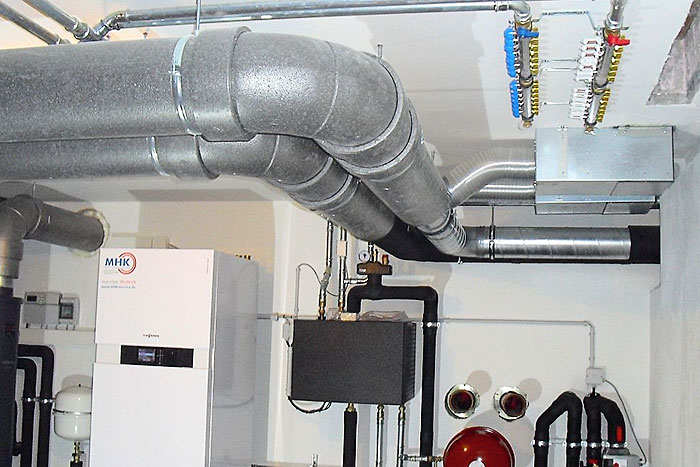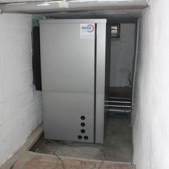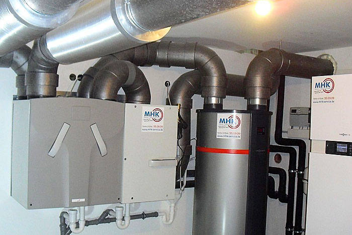 In einem bestehenden Gebäude wurde die Heizung durch eine Luft-Wasser Wärmepumpe Viessmann Vitocal 350 saniert. Das Gerät ist innen in der Ecke eines Kellerraumes aufgestellt und bezieht zu- und Abluft durch große Mauerdurchbrüche. Durch die Eckaufstellung wurde wirkungsvoll die thermische Rückkopplung unterbunden. Über den Zuluftkanal kann keine kalte Abluft angesaugt werden. Das Warmwasser wird durch eine gesonderte Wärmepumpe Viessmann Vitocal 160 erzeugt. Sie gewinnt die die benötigte Energie aus der Raumluft.