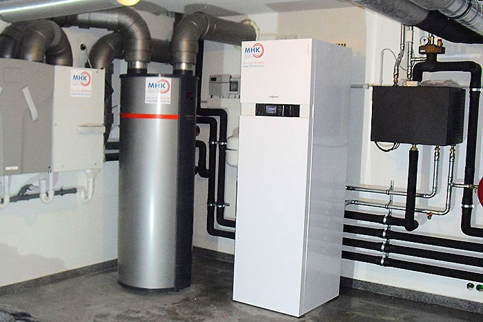 In einem bestehenden Gebäude wurde die Heizungsanlage durch die Luft-Wasser Wärmepumpe Viessmann Vitocal 350 saniert. Die Pumpe für Innenaufstellung wurde in einem Fahrradabstellschuppen, der an das Haus angebaut ist, aufgestellt. Das Brauchwasser wird durch die separate Wärmepumpe Viessmann Vitocal 160 erwärmt. Die Wärmepumpe entzieht der Kellerluft die benötigte Energie und hat einen internen 300 l Wasserspeicher.