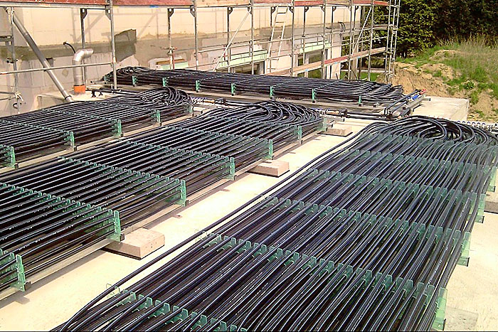 In einem bestehenden Gebäude wurde eine über die Jahre gewachsene Heizungsanlage ( Sole-Wasser Wärmepumpe) mit einer neuen Wärmepumpe ( Viessmann Vitocal 300 ) versehen und dabei technisch generalüberholt. Dabei wurden die seit dem Hausbau bestehenden 8 relativ kurzen Soleleitungen weiter verwendet. Einige davon laufen durch einen unterirdischen Regenwasserspeicher. Das Brauchwasser wird weiterhin durch eine bestehende Solaranlage und durch einen wasserführenden Kachelofen erwärmt.